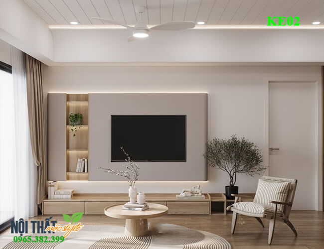 Bạn đang kiếm tìm 1 hệ vách tivi kết hợp trang trí theo phong cách hiện đại tối giản (modern minimalism), nhưng vẫn giữu được nét sang trọng,tinh tế, thể hiện nét thẩm mỹ có gu của gia chủ thì hãy tham khảo ngay mẫu tủ kệ tivi KE02 đẹp mộc mạc, với gam màu gỗ ấm cúng.